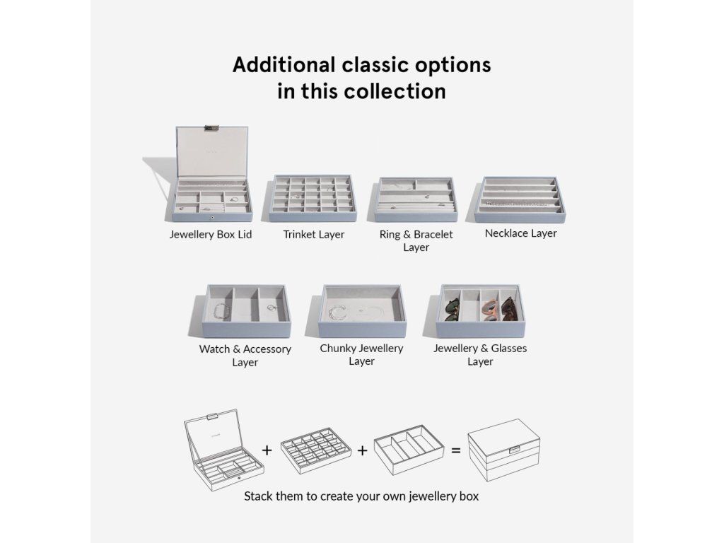 Box na šperky Stackers jsou chytře navrženy, takže si můžete vytvořit vlastní výběrem, které vrstvy a doplňky se nejlépe hodí k vaší kolekci šperků. Alternativně vrstvy šperkovnice umožňují dokonalé uložení šperků v zásuvce, pokud chcete mít svůj toaletní stolek čistý.