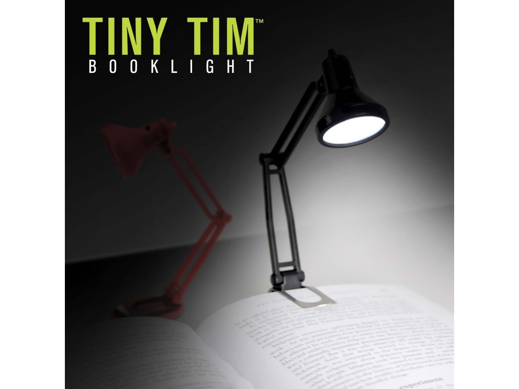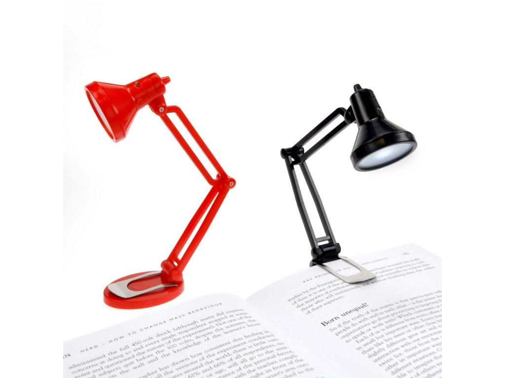 Malá bateriová lampa s polohovatelnou hlavou Připíná se ke knize nebo stojánku u notebooku.
