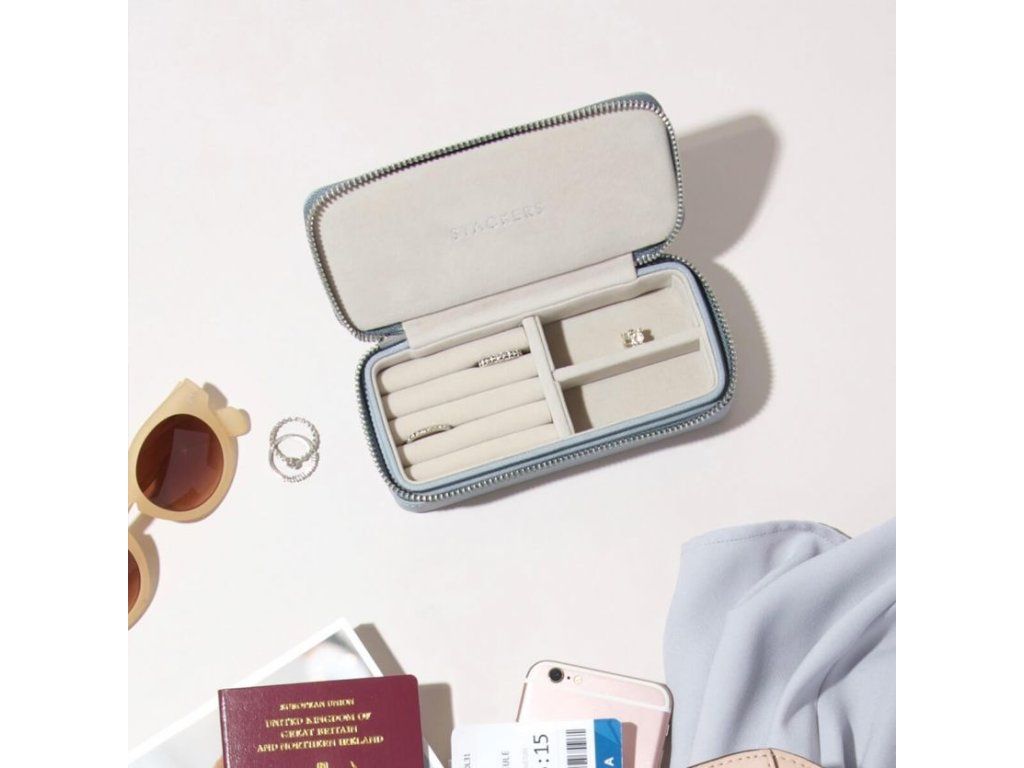 Cestovní šperkovnice Stackers Dusky Blue Medium Travel je vyrobená z luxusní kůže s měkkou sametovou podšívkou, která po dobu cesty bude chránit vaše šperky. Má ideální velikost na cestování a je vhodná pro prstýnky, náušnice a pár větších doplňků.