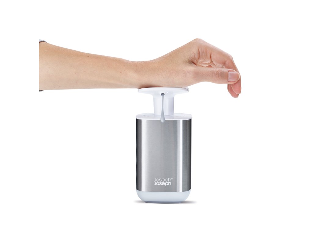 JOSEPH JOSEPH přichází s dalším praktickým nápadem usnadňujícím mytí rukou. Po dávkovači C-Pump, který poprvé umožnil snadný stisk a nabrání mýdla jednou rukou, je další inovací britských designerů dávkovač Presto. Máte-li špinavé obě ruce, můžete velkou nerezovou hlavici dávkovače JOSEPH JOSEPH Presto pohodlně stisknout zápěstím nebo předloktím. Zabránite tak nechtěné kontaminaci pumpy dávkovače (například v okamžiku, kdy připravujete syrové maso nebo ryby).