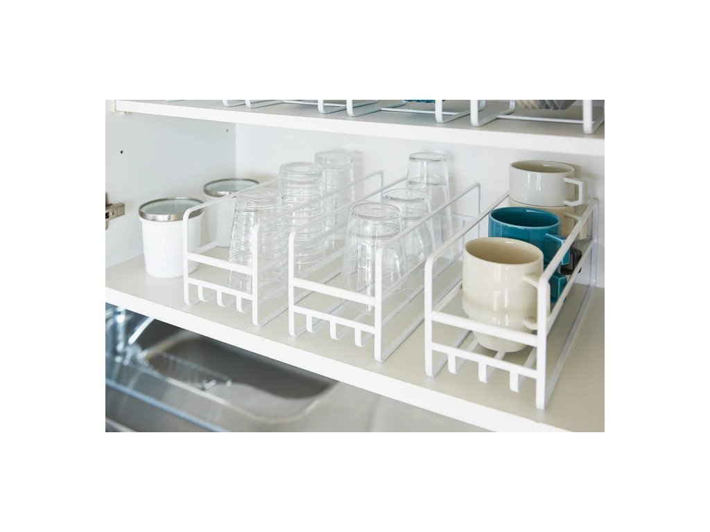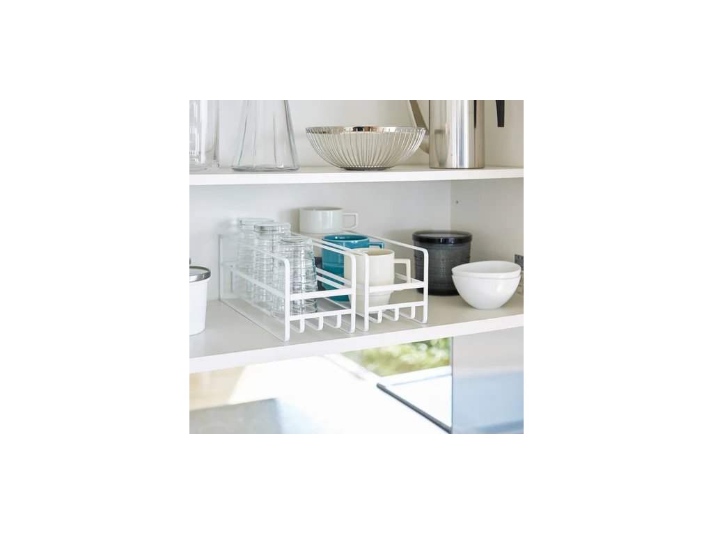 Tento chytrý stojan pomáhá udržovat vaše kuchyňské skříňky uspořádané a zajišťuje bezpečné uložení hrnků, lahví a sklenic. Vyznačuje se praktickou rukojetí se silikonovým krytem, který usnadňuje vytahování a umožňuje dosáhnout na brýle i v zadní části skříňky.