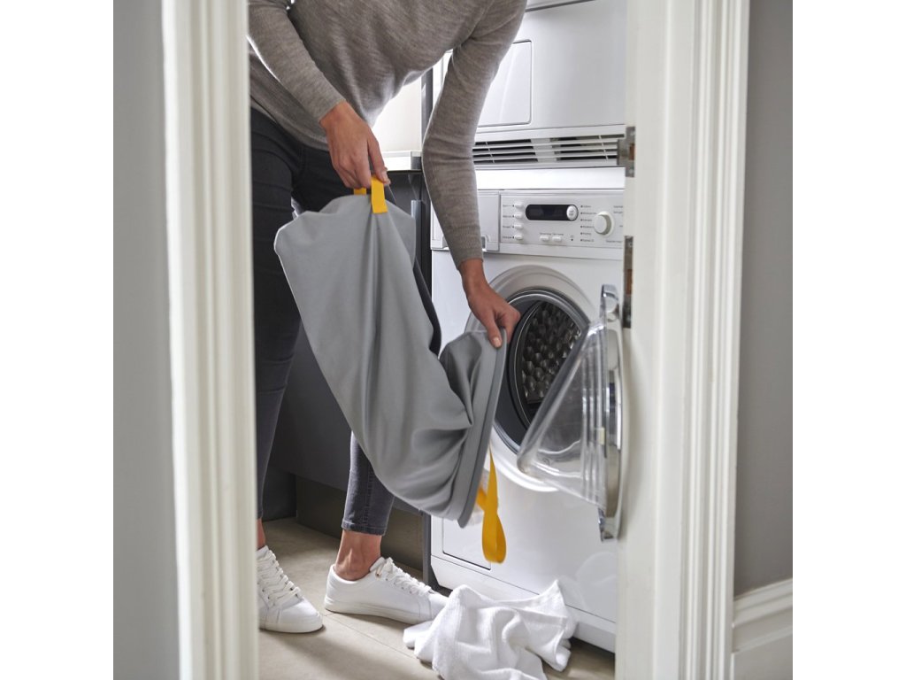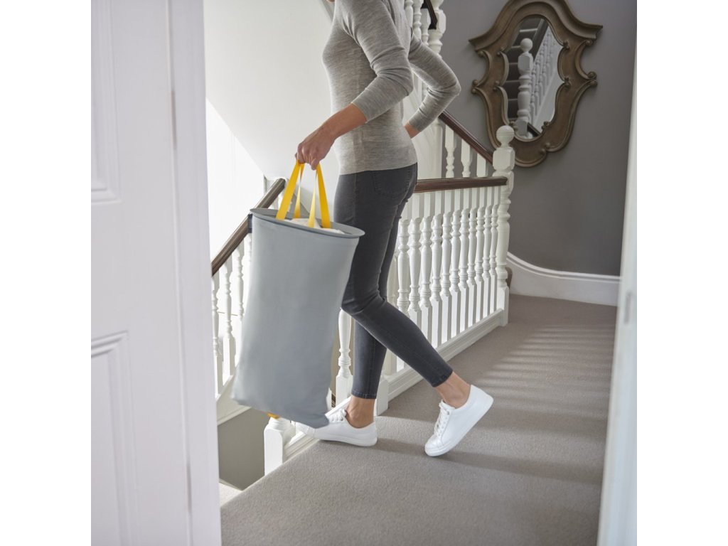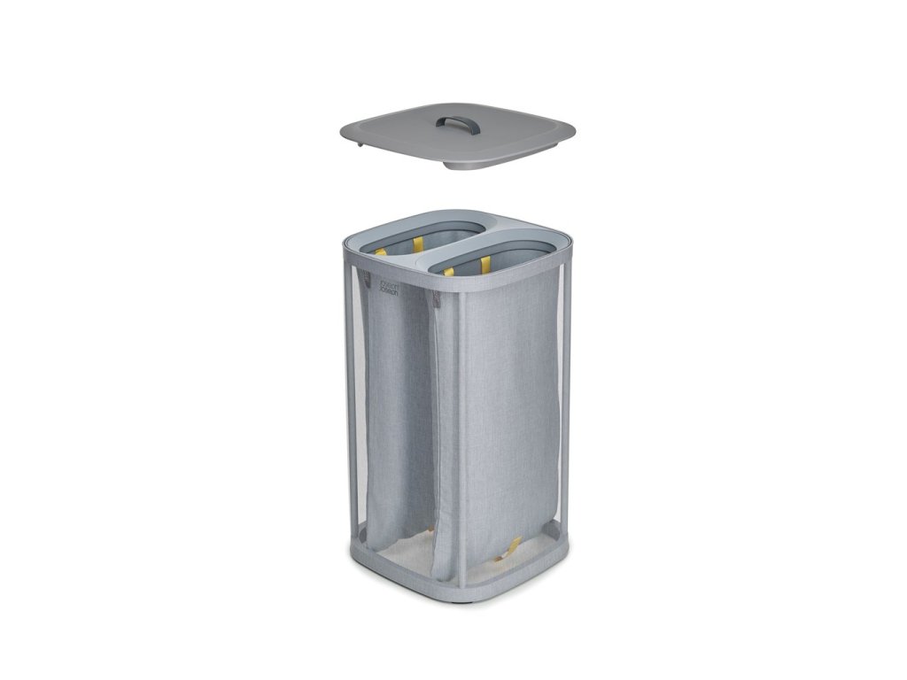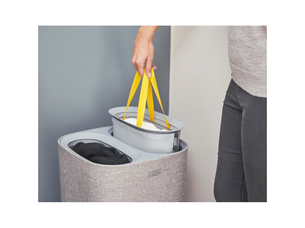 Koš na prádlo JOSEPH JOSEPH Tota umožňuje předběžné třídění prádla do dvou 30L snadno vyjmutelných pytlů. Pytle mají madla pro pohodlné přenášení do prádelny. Na spodní straně pytlů jsou úchytky usnadňující jejich vyprázdnění.