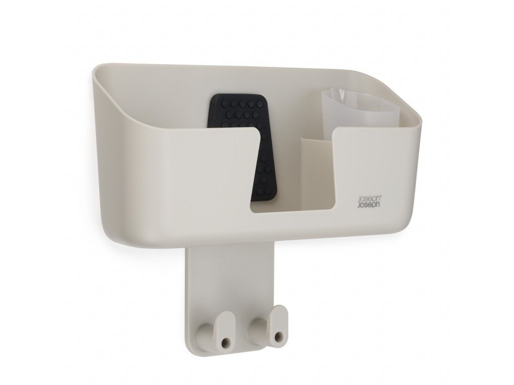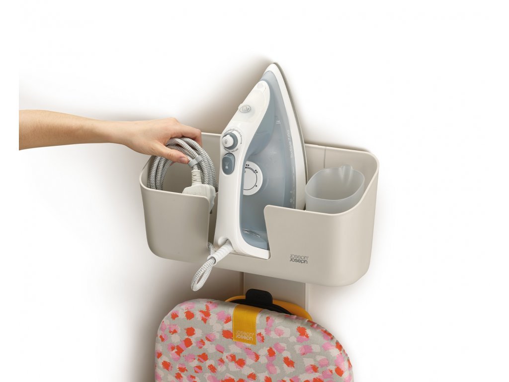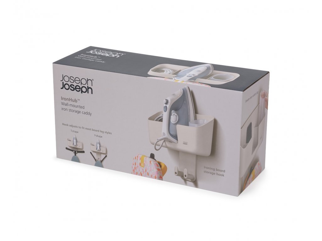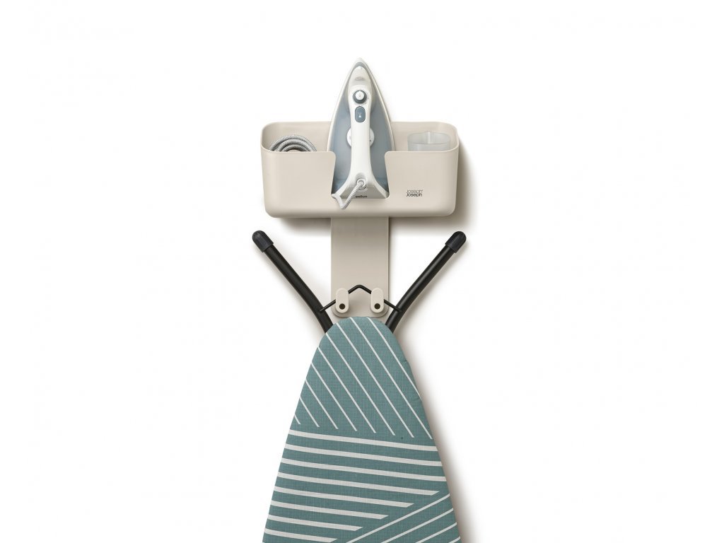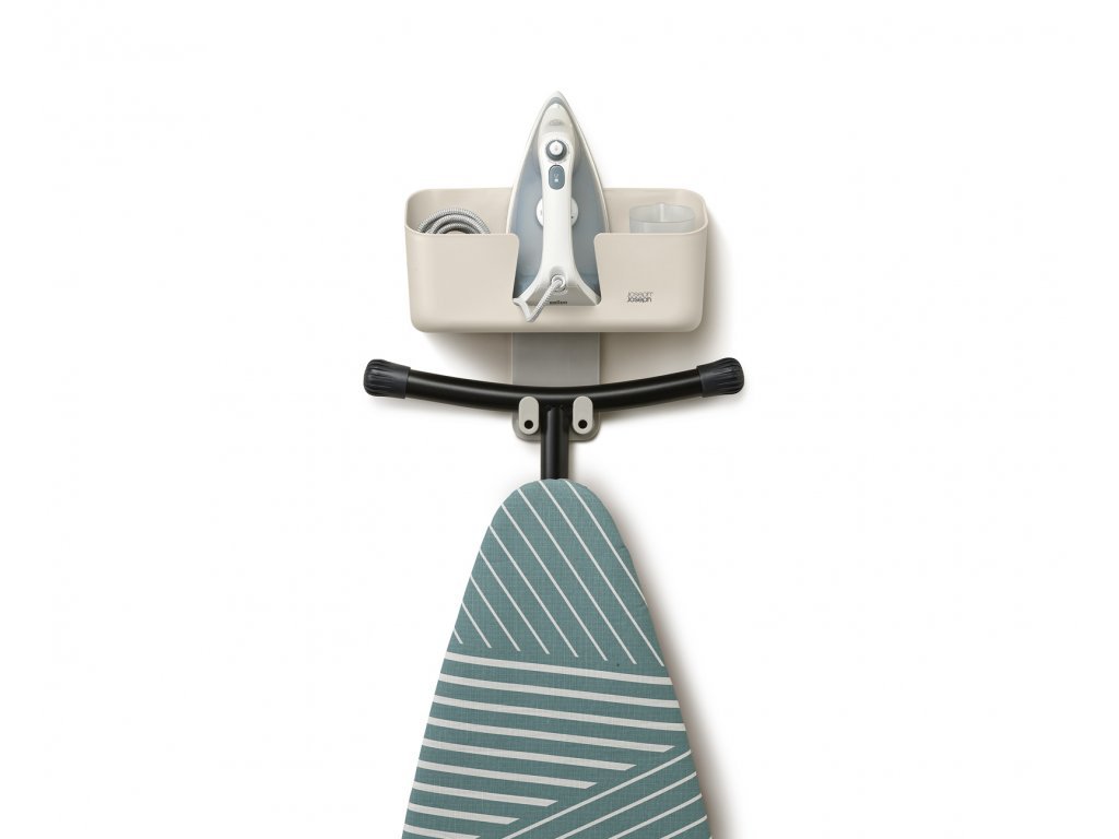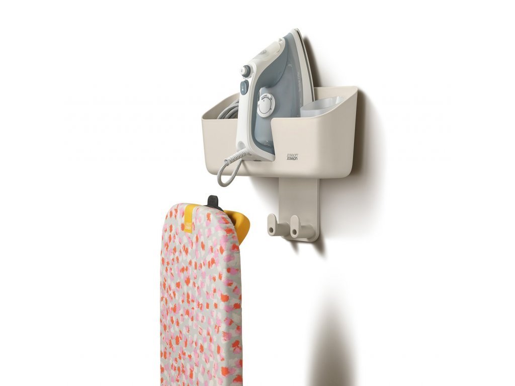 Nástěnný držák k uložení žehlícího prkna, žehličky a jejího příslušenství - JOSEPH JOSEPH IronHub 50043. Vybaven univerzálním háčkem k zavěšení žehlicích prken (ve tvaru T, Y a žehlících prken JOSEPH JOSEPH modelů Glide), prostorem pro žehličku (s kontaktní tepelně odolnou silikonovou plochou), prostorem pro kabel a přihrádkou na nádobku na vodu pro plnění napařovacích žehliček (obsah 350 ml).