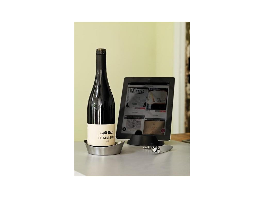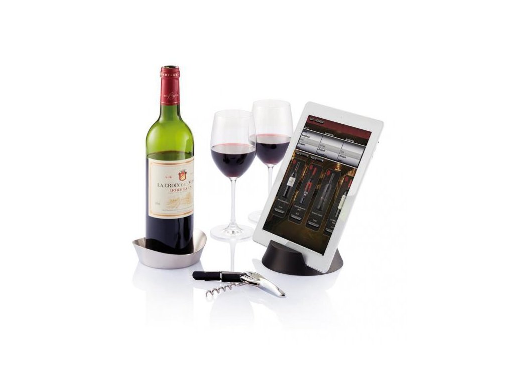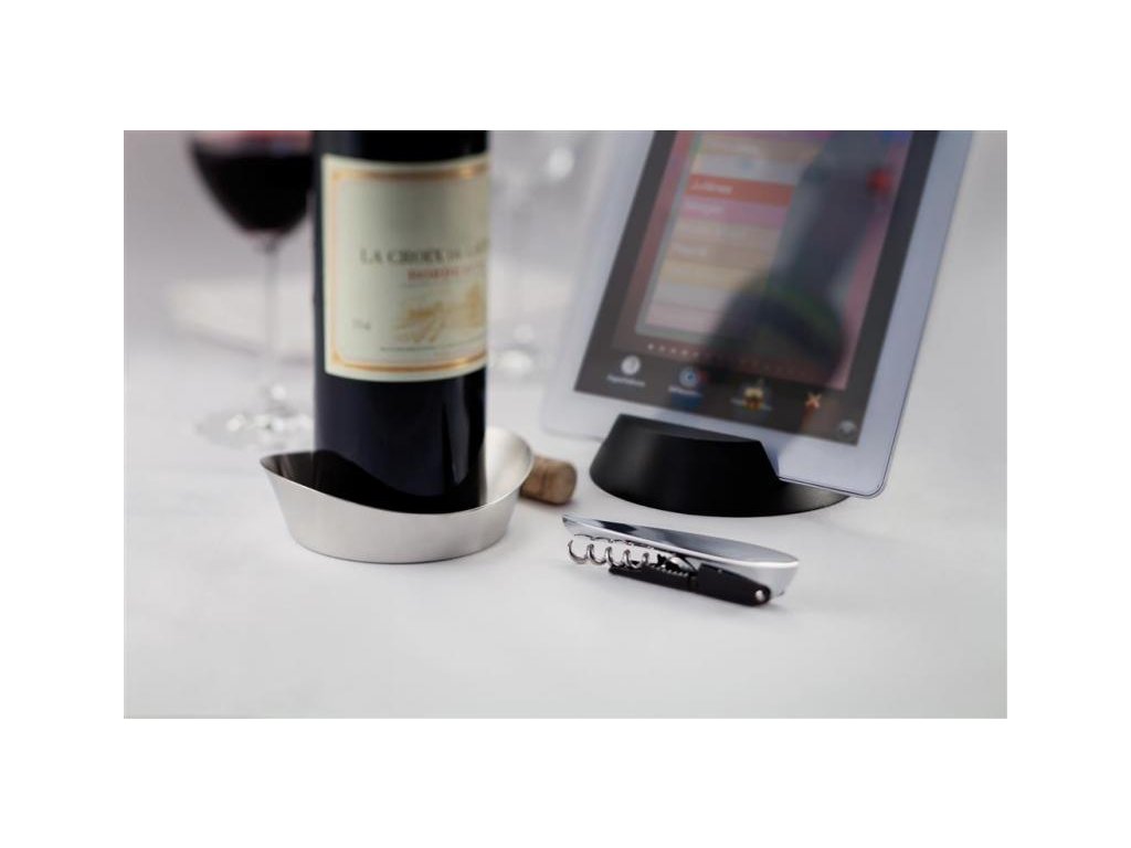 Set obsahuje: otvírák na víno, nerezový podtác na lahev a držák tabletu