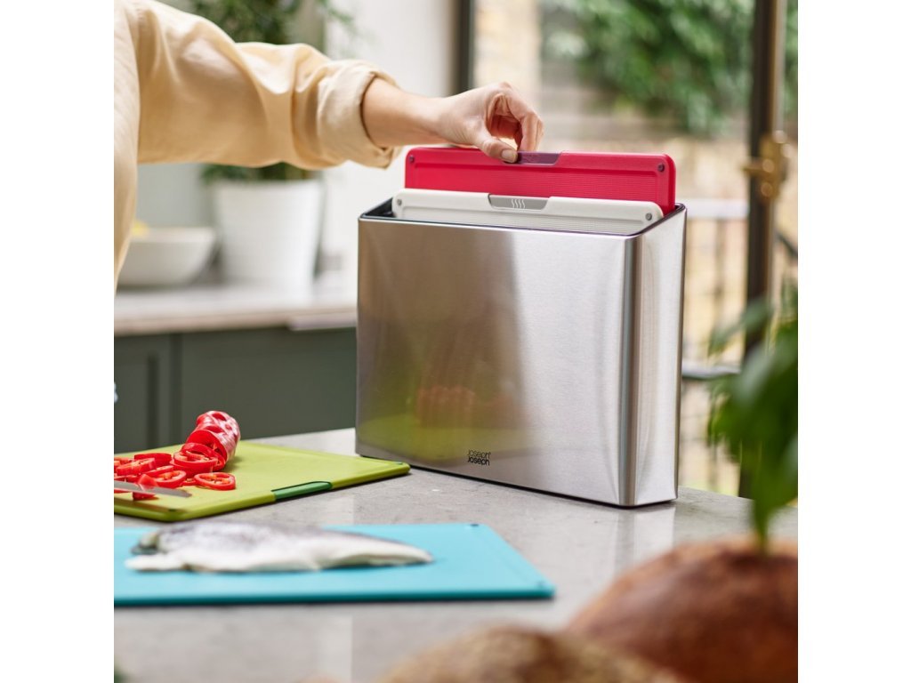 Sada prkének s nerezovým stojanem JOSEPH JOSEPH Folio Icon Steel obsahuje čtyři plastová prkénka určená pro hygienicky oddělené krájení potravin