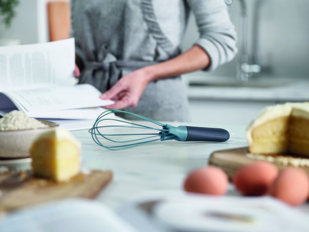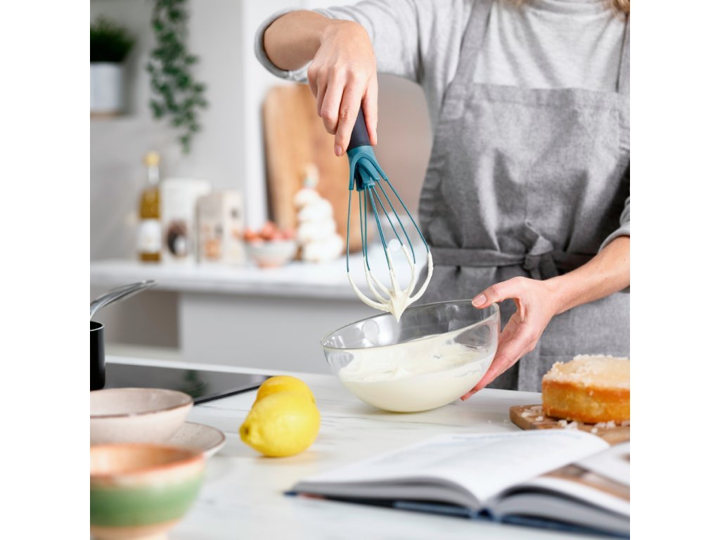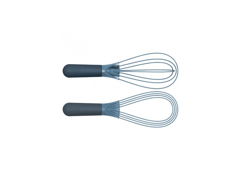 Plochá i balónová metlička v jednom - skládací metlička JOSEPH JOSEPH Twist Whisk. Twist Whisk lze užít jako plochou metličku pro míchání omáček. Snadným otočením konce madla se z ploché metličky stane metlička balónová, vhodná ke šlehání sněhu. Vhodná i k užití na non-stick nepřilnavém povrchu pánve bez rizika poškrábání. Silikonové drátky metličky odolávají teplotám až 270°C. Pro čištění lze metličku zcela rozložit. Do zásuvky se ukládá v plochém tvaru. Výrobek oceněný cenou Red Dot. Velikost ploché metličky je 29,5 x 8 x 4 cm, v balónovém tvaru 29,5 x 8 x 7 cm.