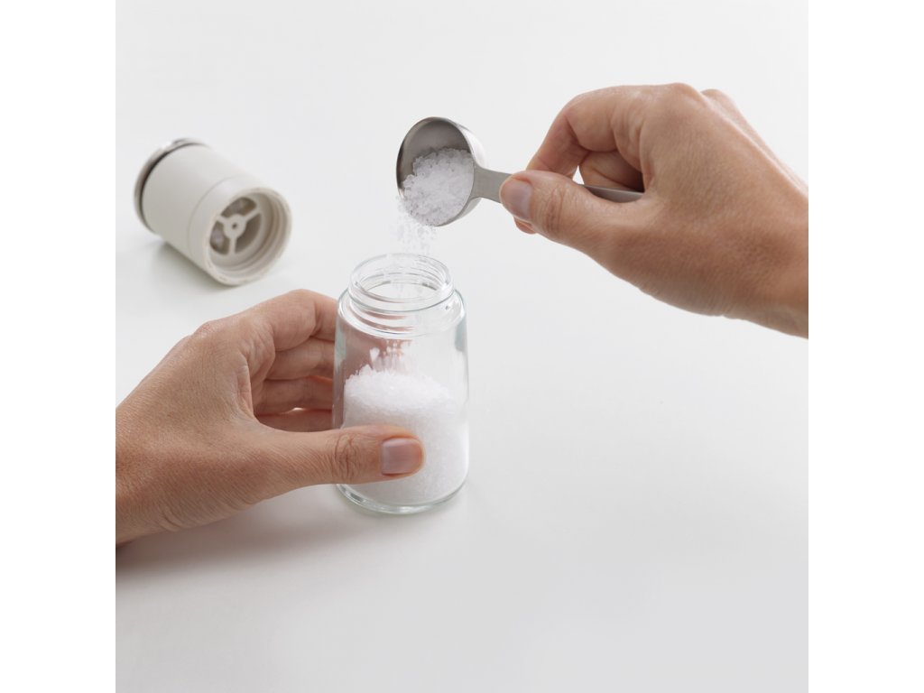 Problémem běžných mlýnků na pepř a sůl je odpadávání zbytků pepře a soli po odložení mlýnků na pracovní nebo jídelní plochu. JOSEPH JOSEPH řeší tento problém u mlýnků Duo tak, že po užití mlýnek otočíte mechanikou vzhůru a zbytky pepře nebo soli propadnout zpět do zásobníků. Univerzální keramická mlecí mechanika mlýnků Duo je zakryta elegantním nerezovým kolečkem, jehož otáčením se nastavuje hrubost mletí. Velikost: 14 x 5,4 x 5,4 cm.