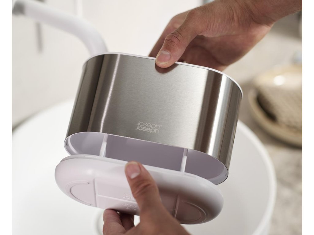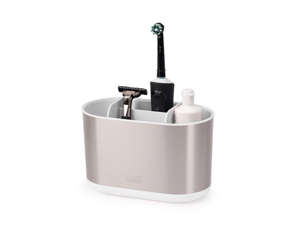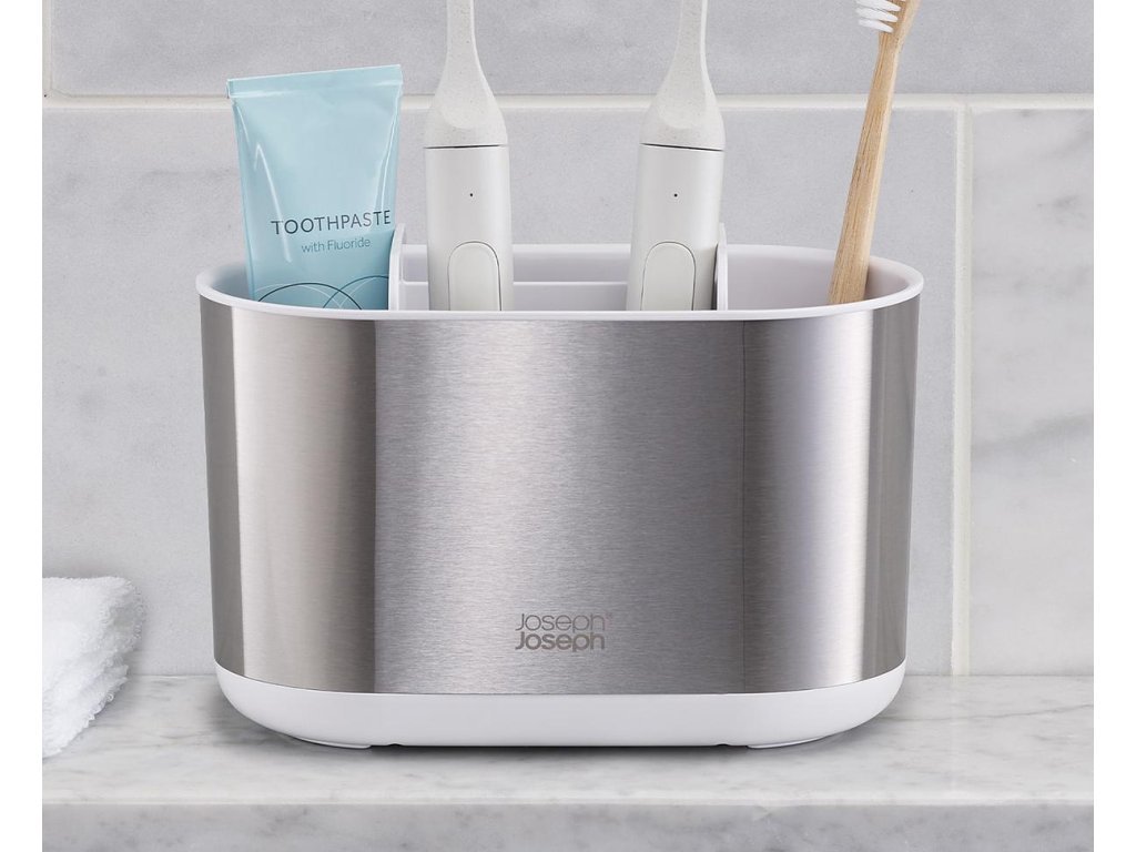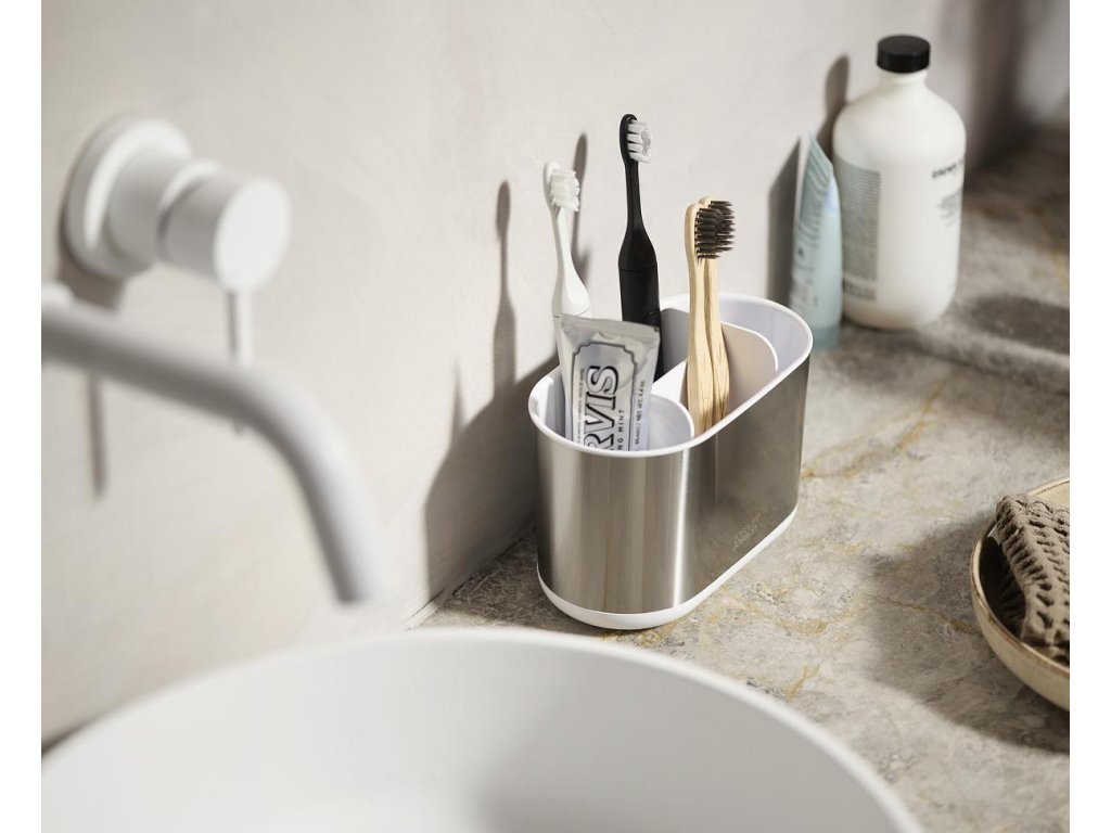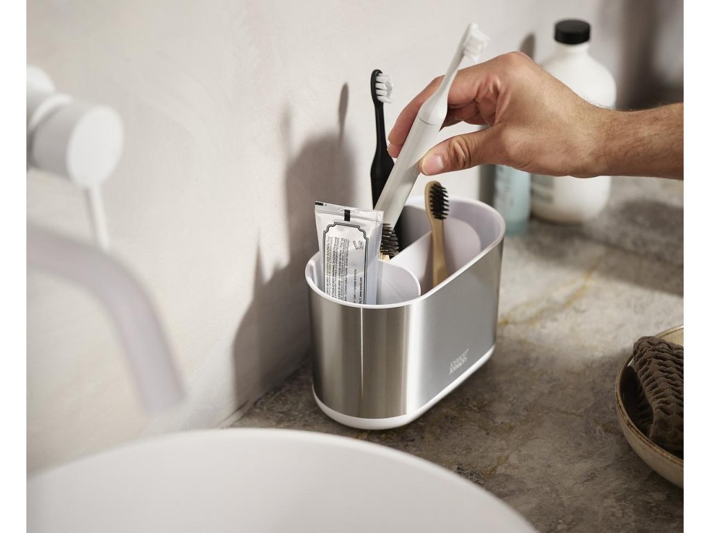 Stojánek na kartáčky JOSEPH JOSEPH Duo 70606 je rozdělený do 4 sekcí poskytujících prostor pro běžné kartáčky, elektrické kartáčky a pastu. Stojánek je snadno rozebratelný a čistitelný, s odvětrávacími otvory pro rychlé vysychání a protiskluznou základnou. Nerezový povrch s tzv. fingerprint-proof úpravou je odolný proti zanechávání otisků prstů.