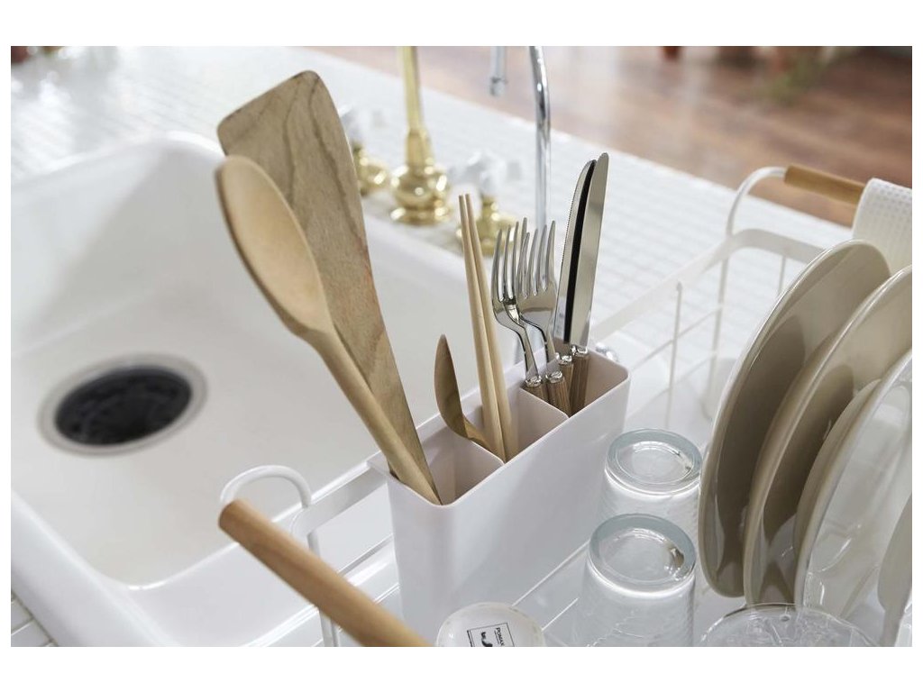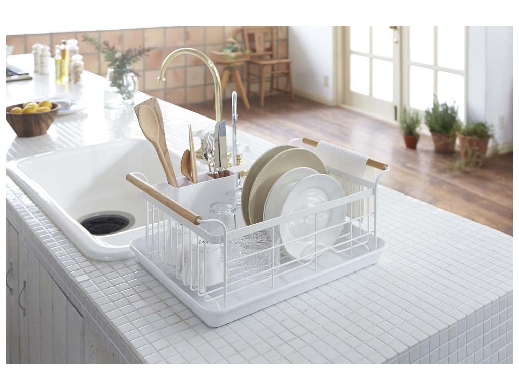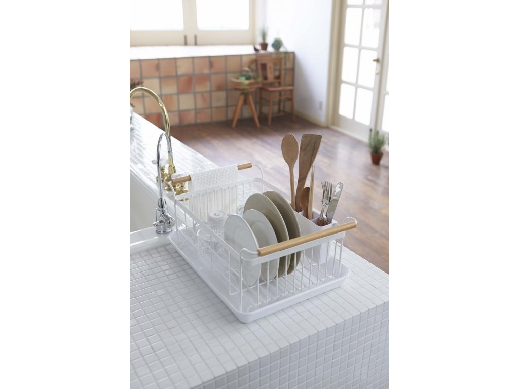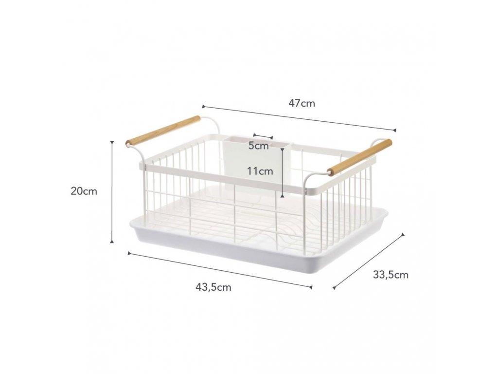 Elegantní odkapávač z lakovaného kovu, bukového dřeva a plastu.