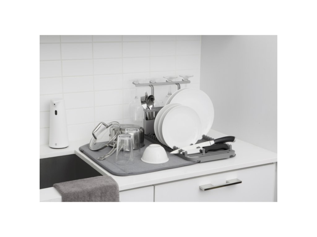 Skládací odkapávač Udry má základ / spodek který vyroben z mikrovláken a absorbuje vodu ze sušárny zároveň chrání desky před poškrábáním a nahromaděním vody, nádobí se nesklouzne a pohodlný plastový držák vám umožní položit talíře ve svislé poloze tak, aby kapičky vody proudily rychleji dole. Odkapávač po použití se sklopí do kompaktní složky a šetří místo ve vaši kuchyní.