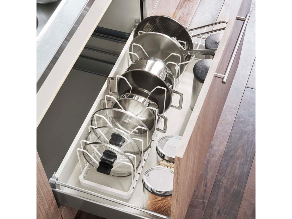 Stojánek na pokličky a pánve s nastavitelnou šířkou.