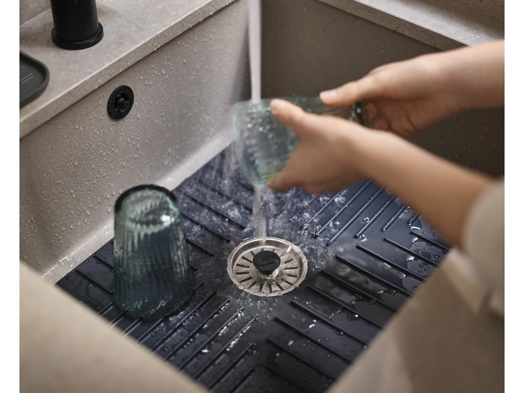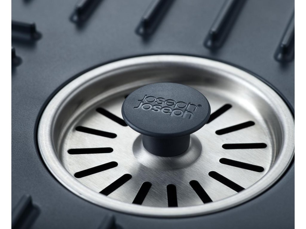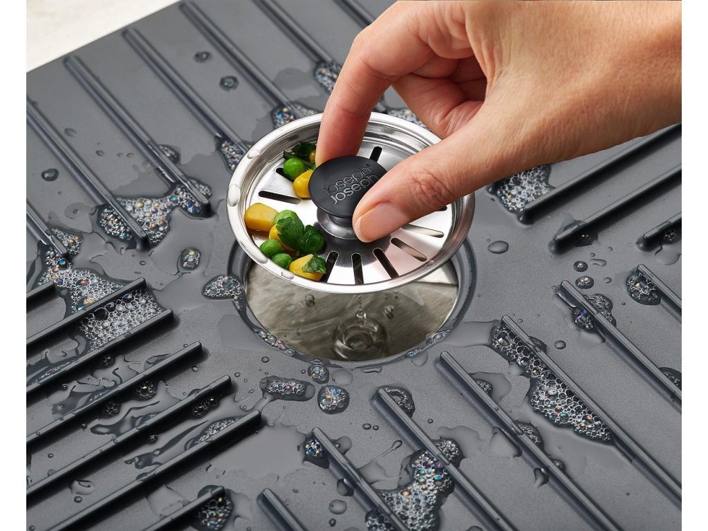 Podložka do dřezu JOSEPH JOSEPH SinkShield pomáhá předcházet poškození křehkého nádobí při mytí a zároveň zabraňuje poškrábání povrchu dřezu. Podložka má odnímatelné sítko k zachycení zbytků jídel. Drážky na povrchu podložky odvádějí vodu. Protiskluzové nožky zajišťují stabilitu a zároveň vytváří pod podložkou prostor pro odtok vody. Podložka je snadno čistitelná (myjte a sušte ručně). Nádobí nechte před vložením do dřezu s podložkou vychladnout na pokojovou teplotu. Podložka není určena k použití ponořená.