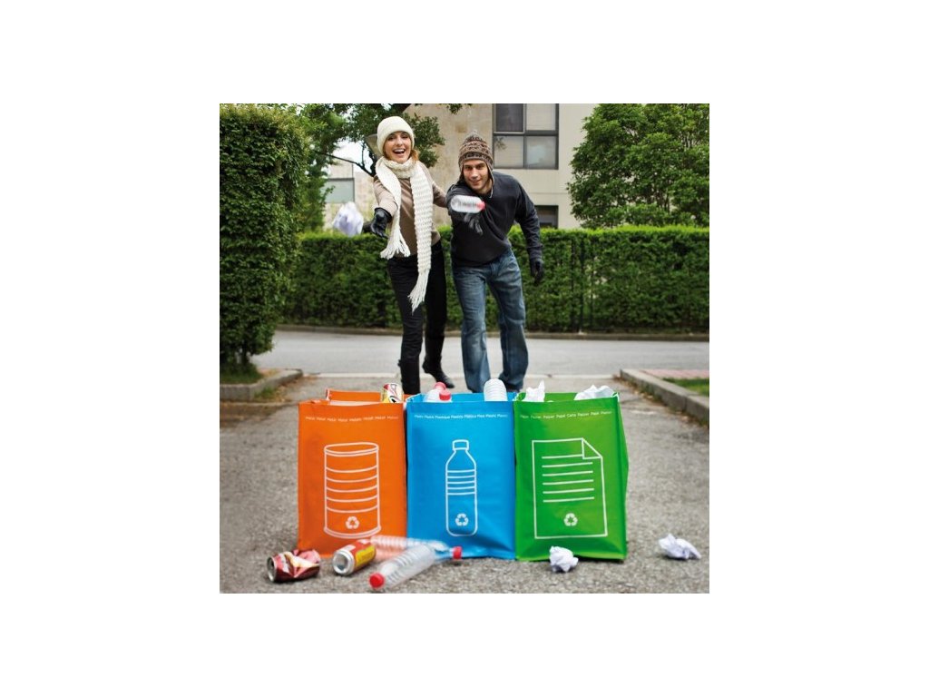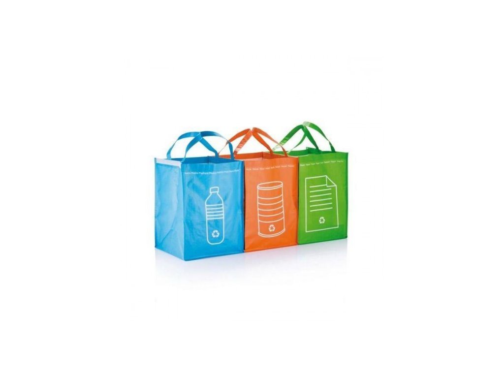 Recyklace použitého materiálu nemusí být vůbec žádná nuda. Tři nádoby ve tvaru tašek Vám pomohou roztřídit papír, plast a kov či sklo. Záleží jen na Vás na který odpad nádoby použijete.