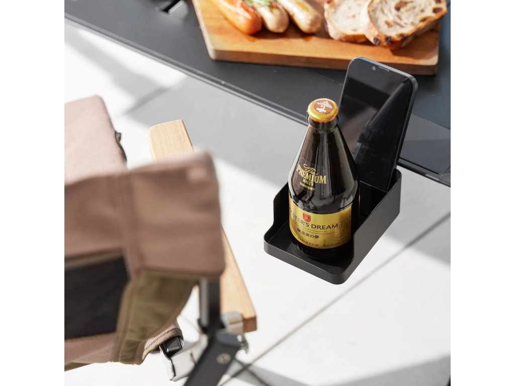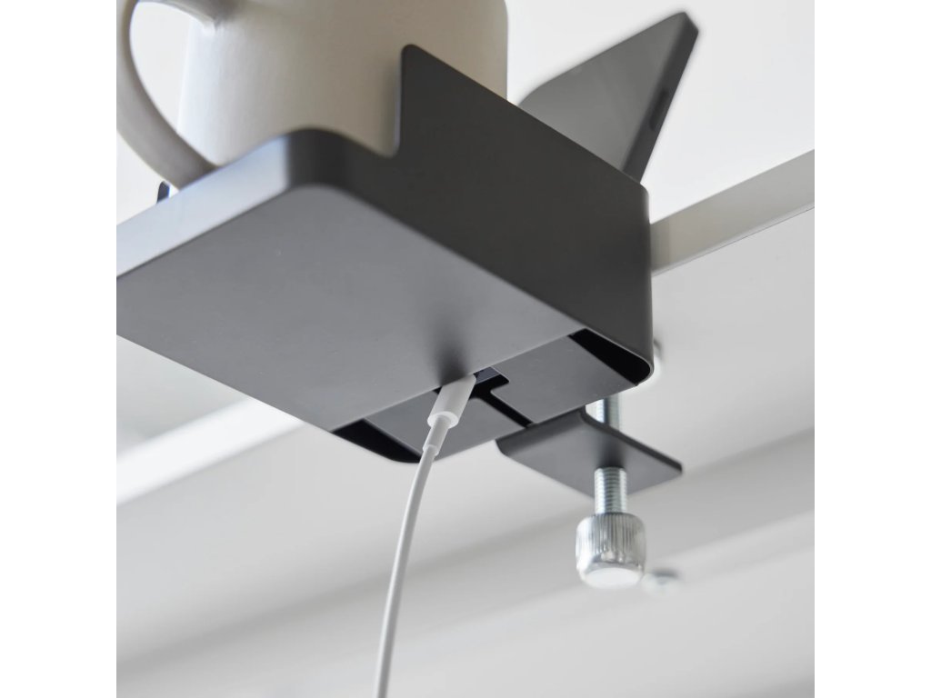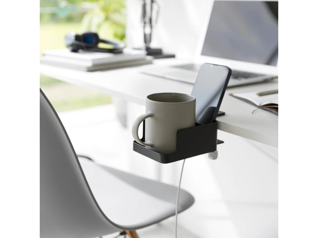 Praktický držák k upevnění ke stolové desce nebo područce křesílka pomocí nastavitelných šroubů - YAMAZAKI Tower 1639. Nabízí příhrádku na hrnek a telefon nebo dálkový ovladač. Spodní otvor umožňuje snadné protažení nabíjecího kabelu. Materiál: lakovaný kov. Velikost: 8,2 x 9 x 16,5 cm (VxŠxH) / nosnost: 1,5 kg.