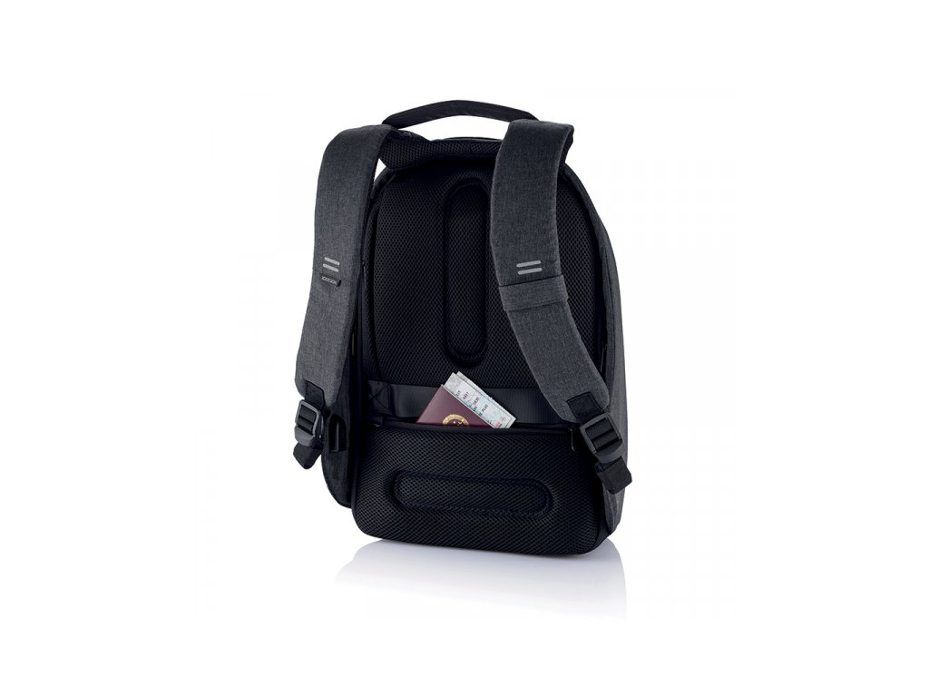 Na zadní straně XD Design Bobby Hero bylo místo pro dvě kapsy. Dolní je chráněna před útoky RFID a je určena pro biometrické pasy a jízdenky. Nad ní je našitý popruh pro připevnění batohu k rukojeti kufru. Zatímco batoh visí na zádech, kapsa je zcela skryta - v normální situaci nejsou dokumenty potřeba. Když je batoh na letišti, je k dispozici kapsa s dokumenty, kterou lze na vyžádání vytáhnout.