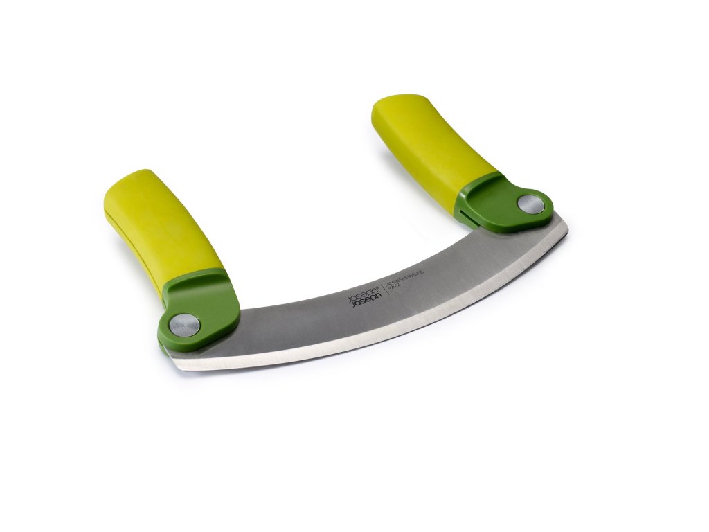 Kolébkový kráječ bylinek JOSEPH JOSEPH Mezzaluna 10079. Díky pohyblivému spojení ergonomicky tvarovaných madel s ostřím zůstávají madla při práci s kolébkou v pohodlné svislé poloze. Po úplném sklopení slouží madla jako bezpečné kryty nerezového ostří. Kráječ myjte pouze ručně a po umytí ihned osušte. Velikost: 2 x 11 x 18 cm.