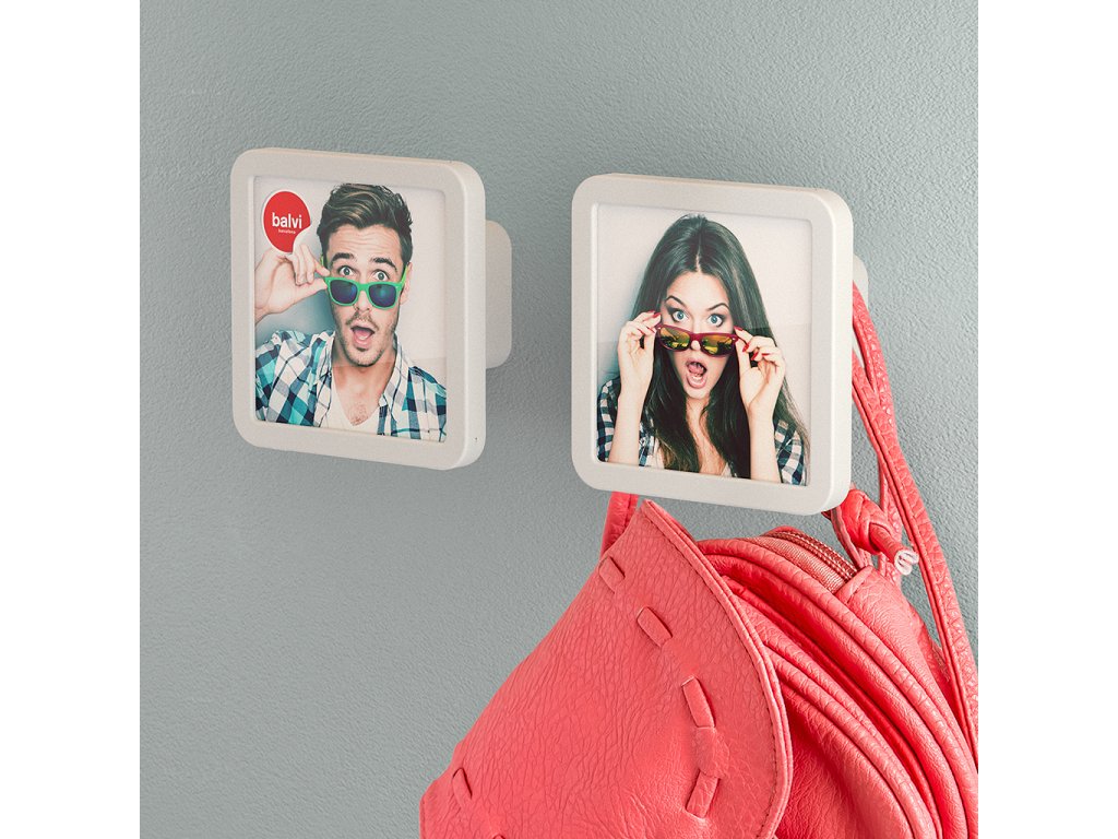 Plastové nástěnné věšáčky BALVI Kick s prostorem pro fotografii formátu 8 x 8 cm.